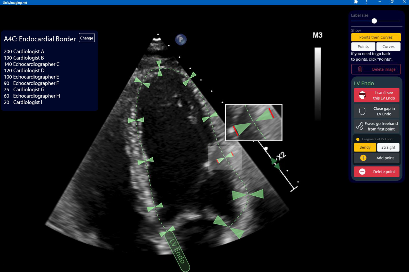 The Unity web-based, interactive, real-time annotation platform enables clinical experts across the UK to collaboratively and efficiently label medical images. The platform’s intuitive interface allows experts to annotate key anatomical structures with precision, including critical features such as key points and curves along the endocardial border, as illustrated above. The platform’s accessibility and real-time capabilities facilitate large-scale multi-expert annotations, enhancing the quality and accuracy of labelled datasets for medical image analysis.